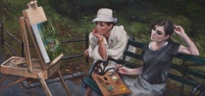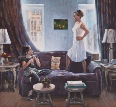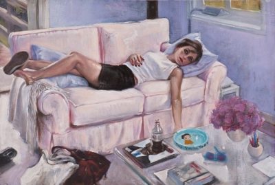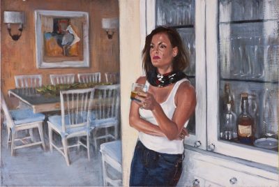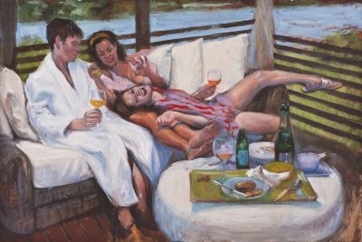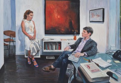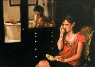 The storyline for this narrative series of small oils was inspired by Claude Chabrol’s 1968 melodrama Les Biches. This story of an heiress -- and the young would-be artist who is first taken in by her and then ultimately, by murdering her, attempts to supplant or become her -- is a meditation on the tenuous if not dangerous relationship between artist and patron in bourgeois society. Chabrol’s story took place in chic Paris and St Tropez; Brown’s interpretation stages the scenes in posh Manhattan and the Hamptons. Brown plays the heiress while actress Hollis Witherspoon (previously featured in Brown’s “Chelsey Green” video and painting series) plays the unbalanced ingenue. The series was shown at Gallery Hyundai, Seoul, in 2011, and Angles Gallery, Los Angeles, 2012. More