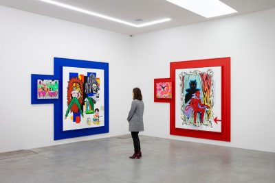 Lang unveils character-packed paintings for his fifth solo show with the Danish dealer titled “Taking Off For Other Dimensions.” Across the pieces, the artist injects a visual psychedelia of skulls and demons alongside popular cartoon subjects including Spiderman, Bugs Bunny, and The Smurfs. In displaying these works, the artist paired larger pieces beside smaller works that are mounted atop boldly-colored frames that create a unique contrast against the white walls of the institute. More